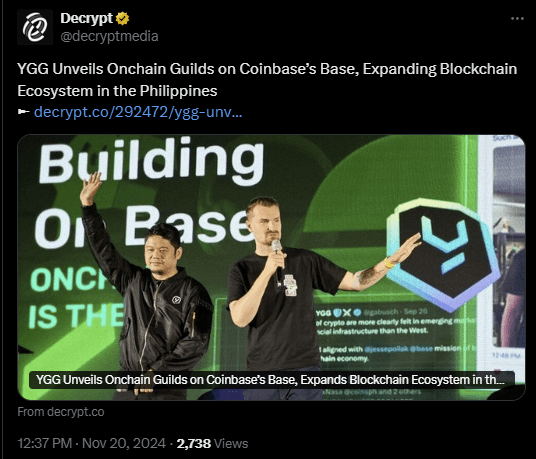 “Whether through competitive esports teams, decentralized artist collectives, or AI-driven projects, Onchain Guilds positions YGG as a leader in bringing communities together around on-chain movements,” wrote Phil Hall of PlayToEarn.