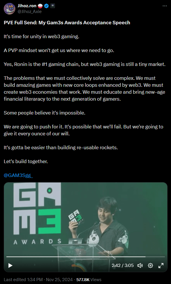 Ronin won the "Best Ecosystem" award, and co-founder Jihoz gave a heartfelt speech to the crowd. He called for unity in the Web3 gaming industry as Ronin transitions to an open and permissionless network. "With the opening of Ronin, this is a great opportunity to make the space more harmonious," Jihoz said in his acceptance speech.
