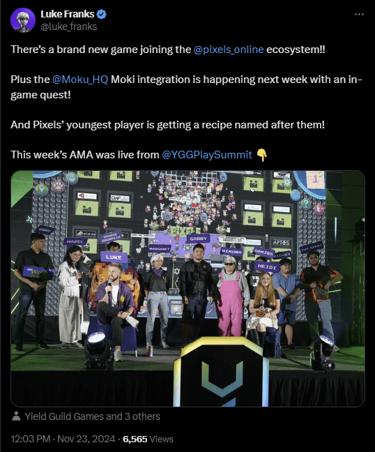 Pixels founder and CEO Luke Barwikowski and Pixels COO Heidi Christine took the stage to answer questions from the community. In addition, the AMA was live-streamed to the YGG Zone in Pixels, where players could complete tasks to earn extra rewards. Viewers attending the live AMA witnessed Terra Villa come to life, with cosplayers dressed as their favorite Pixels characters joining Luke and Heidi on stage. Even YGG co-founder Gabby Dizon dressed as her own NPC in Pixels.