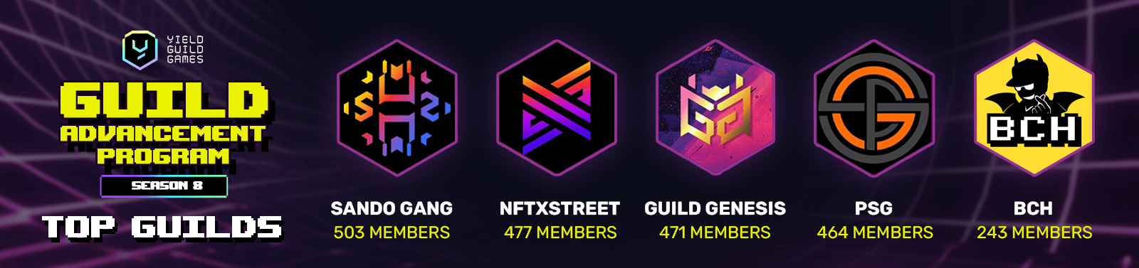 As of the end of December, 75 communities have registered as "on-chain guilds", with a total group wallet value of nearly $750,000. Some of these guilds participated in GAP guild missions, and 49 "on-chain guilds" signed up for at least one mission. Among the 11 guilds that made it to the GAP Season 8 leaderboard, Sando Gang topped the list.