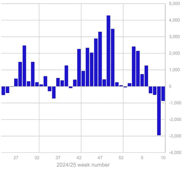 Institutional investors have sold digital assets for four consecutive weeks. The week ending March 7 saw outflows of $876 million from digital asset investment products.