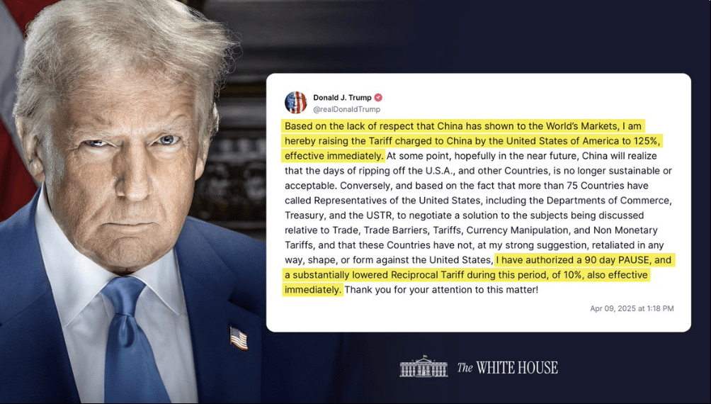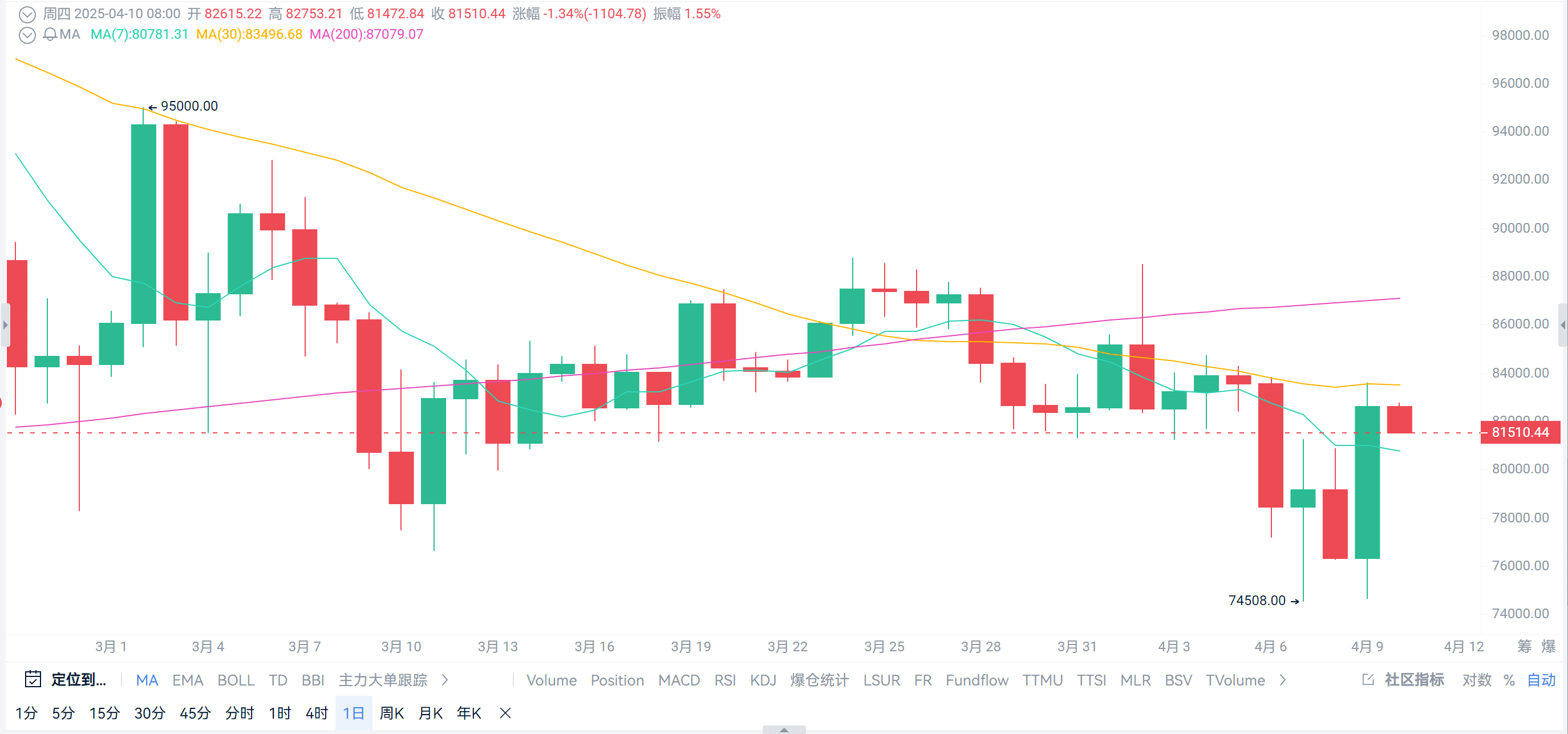 Surge? In recent days, Lao Yi has already reminded everyone that yesterday BTC had an overall increase of 8.25% (6292.8), with a volatility of up to 11.75% (8968). Although not all could be captured, securing more than half of the chips is still quite considerable. Friends who were bearish last night seem to have gone silent. Lao Yi still wants to remind everyone that when the trend is clear, it is best to follow it; when the situation is unclear, align with the major players. The facts prove that Trump has always targeted us; the tariffs on our products have eventually increased to 125%, while the reciprocal tariffs on over 75 regions have been significantly reduced to 10%, and tariffs have been suspended for 90 days for everyone except us. U.S. stocks and BTC rebounded in response, with the Nasdaq rising 12.16%, marking the largest single-day increase since 2001. The uncertainty regarding tariffs has been significantly reduced, and there will be a 90-day window, which has also sparked quite a bit of speculation.