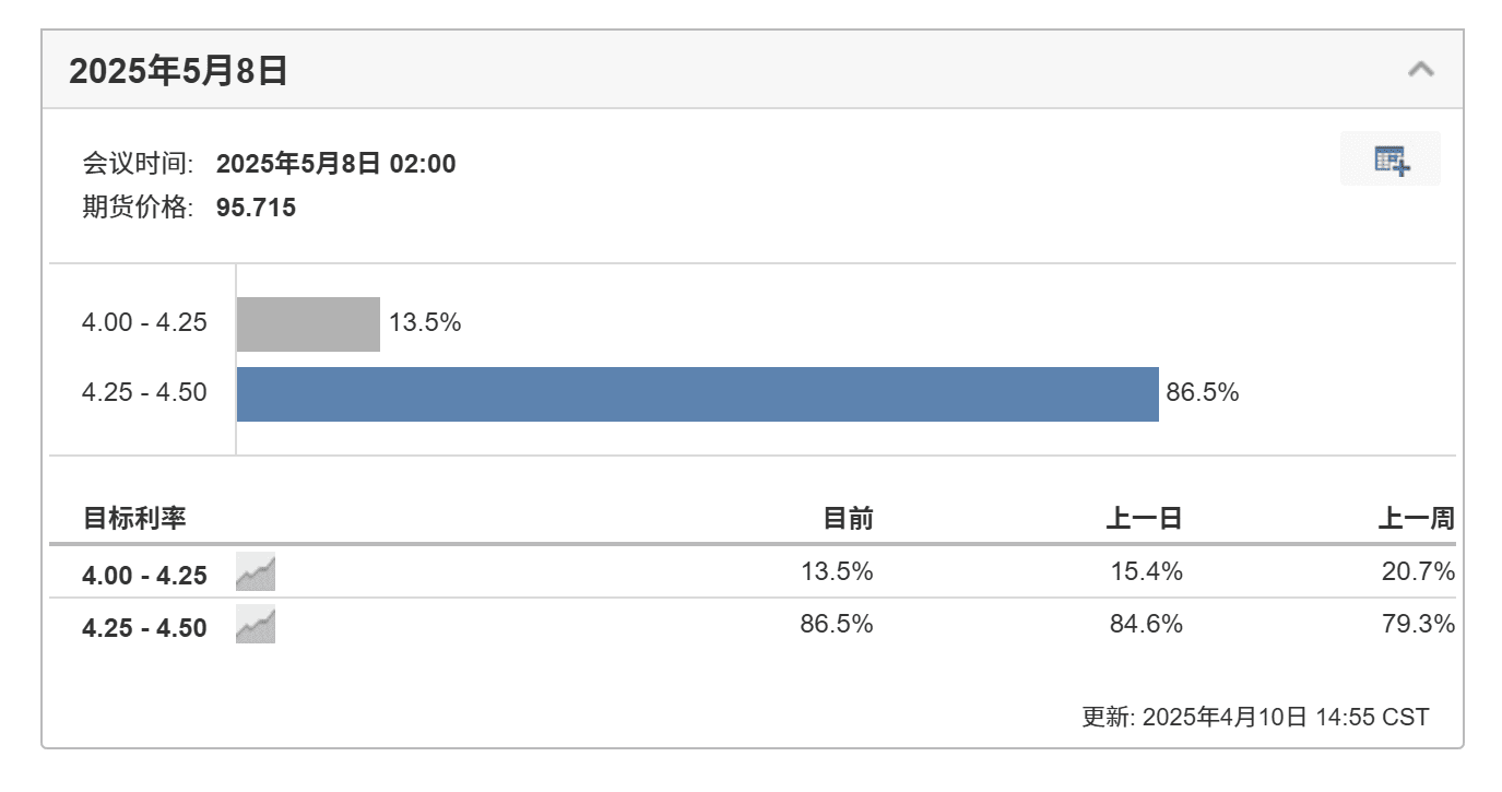 Tonight at 20:30, the U.S. will announce the CPI inflation data for March. Lao Yi mentioned on Monday that an overall decline in inflation is expected, from the previous 2.8% down to 2.6%, or even 2.5%. This brings us closer to the Fed's inflation target of 2%. It seems to be beneficial for BTC, but we also need to pay attention to the core inflation level. Additionally, the minutes from the Federal Reserve's monetary policy meeting indicate that officials unanimously believe Trump's reciprocal tariff strategy has led to high economic uncertainty; hence, the Fed continues to pause interest rate cuts due to concerns that Trump's tariff strategy may push up inflation, the impact of which may last longer than anticipated. Currently, the CME forecast data indicates that the probability of no rate cuts in May has returned to nearly 80%, and the possibility of an emergency rate cut has basically been passed, as Trump's strategy has given the market a sense of reassurance.