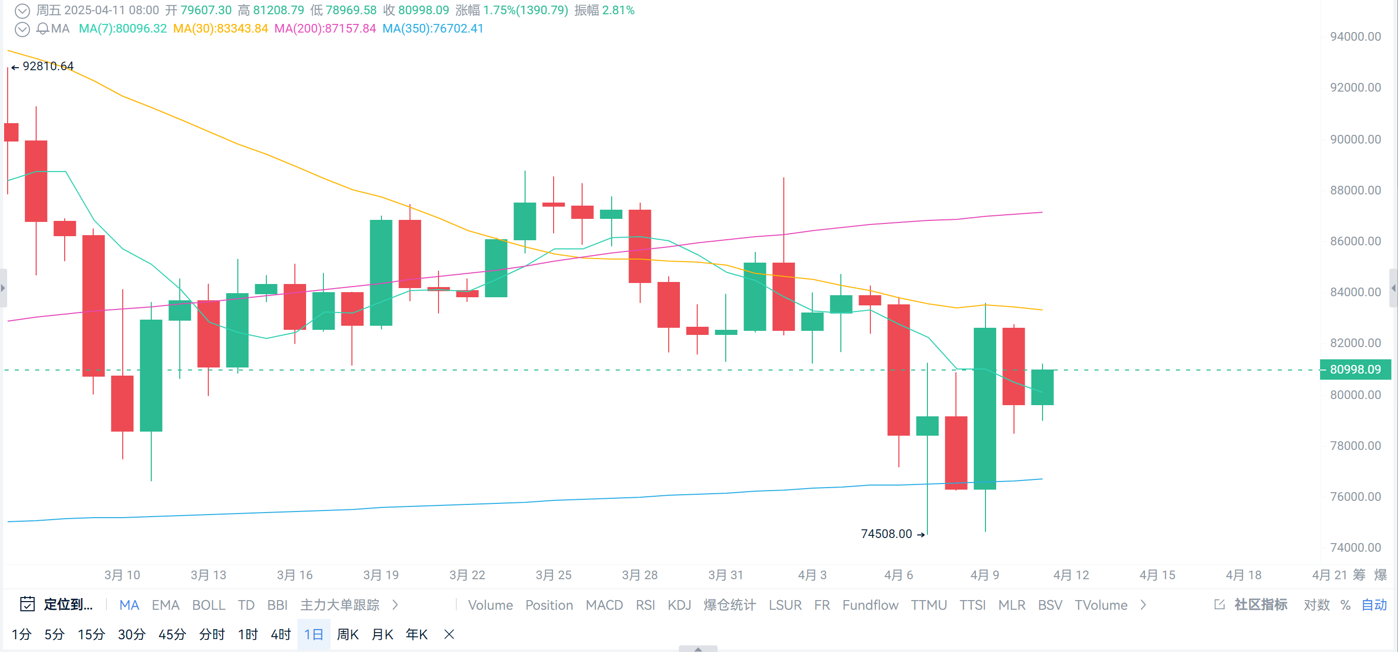 Back to the market, let’s first look at the inflation data released by the US yesterday for March. The CPI rose 2.4% year-on-year, the lowest level in seven months, which is lower than the forecast data we saw earlier; secondly, the core CPI rose 2.8% year-on-year, marking a decline for the second consecutive month, and lower than the expected 3%. It is evident that the inflation data is a positive for BTC, but the market has not seen an upward movement. US stocks, US debt, and the dollar have all fallen sharply, and capital is accelerating its exit from the US. Gold has once again reached a historical high. Our trade war with the US is still ongoing, and yesterday's actions seem to have not stopped. The yield on the 10-year US Treasury bond continues to rise. Previously, we saw US stocks fall, and US debt prices rise, meaning US debt yields would fall. But this is no longer the case; funds are no longer treating US debt as a safe haven, while gold prices have once again reached a historical high. This also indicates that the global demand for safe assets is collectively shifting towards gold. On the other hand, in June this year, a large number of US debts will mature, and there will be a need for refinancing to repay these debts, most of which are short-term US debts. Under the influence of Trump's tariff strategy, the market is increasingly worried about the US fiscal situation. US debts have also seen massive sell-offs, maintaining high yields, which means that refinancing costs are higher, directly contradicting Trump's strategy.