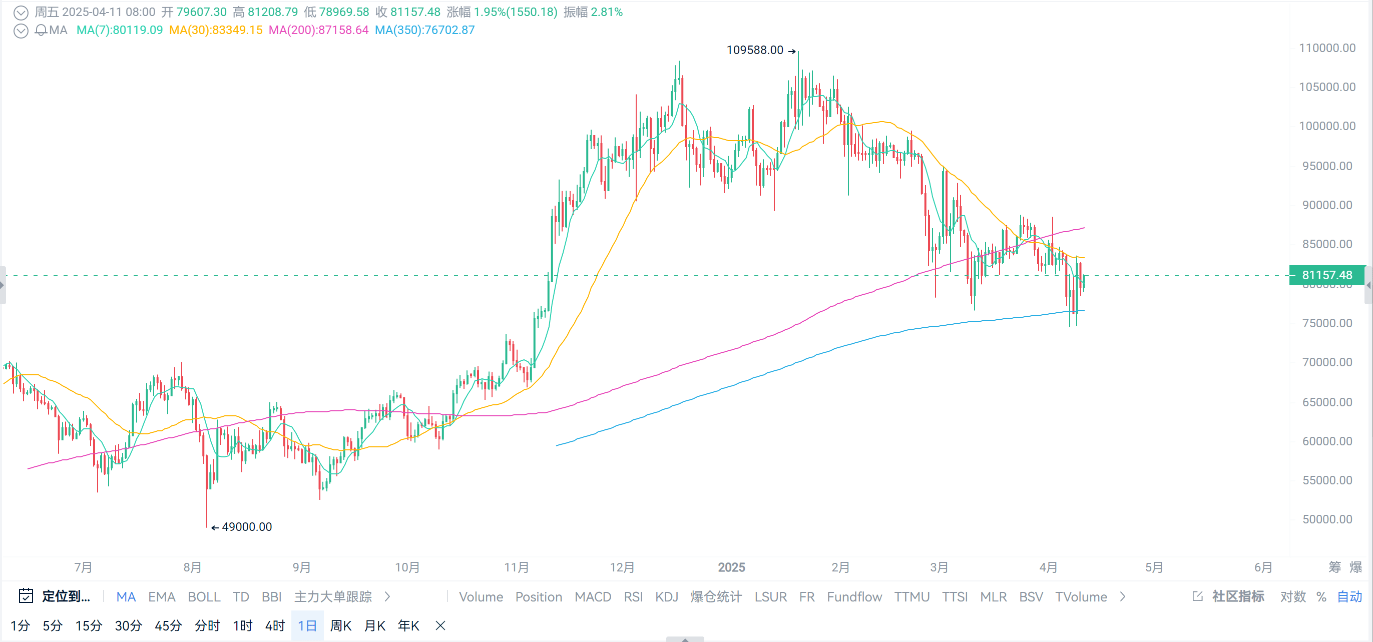 Everyone knows that Lao Yi is still optimistic about BTC's future trend, but many friends have expressed that trends have been validated. Is there a direction worth referencing in technical indicators? Currently, it is still maintained above the 365-day moving average. As long as it does not fall below $76,000, BTC is still in a bull market phase, but currently it is below the 111-day moving average and the 200-day moving average; Looking at the US stock indices, they are currently below the one-year moving average. After Trump’s tariff pause for 90 days, US stocks broke through the one-year moving average in the short term, but the rebound in US stocks has seen more sales. Capital is still accelerating its exit from the US. Whether in the US stock market or the BTC market, both need to reclaim the 200-day moving average to establish further upward momentum, which means BTC needs to stand above $87,000. In recent days, BTC has formed a death cross on the daily chart, with the 50-day moving average crossing downwards with the 200-day moving average. The last time this happened was in early August last year, triggered by the yen arbitrage that led to the market crash. At that time, BTC fell below $50,000, testing the one-year average, and then experienced several months of consolidation until the end of October when a golden cross was seen. This time seems to be similar; BTC may once again enter a period of consolidation. The range of $81,300 to $83,500 needs to turn back into a solid support level for BTC to see a more positive upward pace afterward, but currently, this short-term rebound has not successfully occupied a new range.
