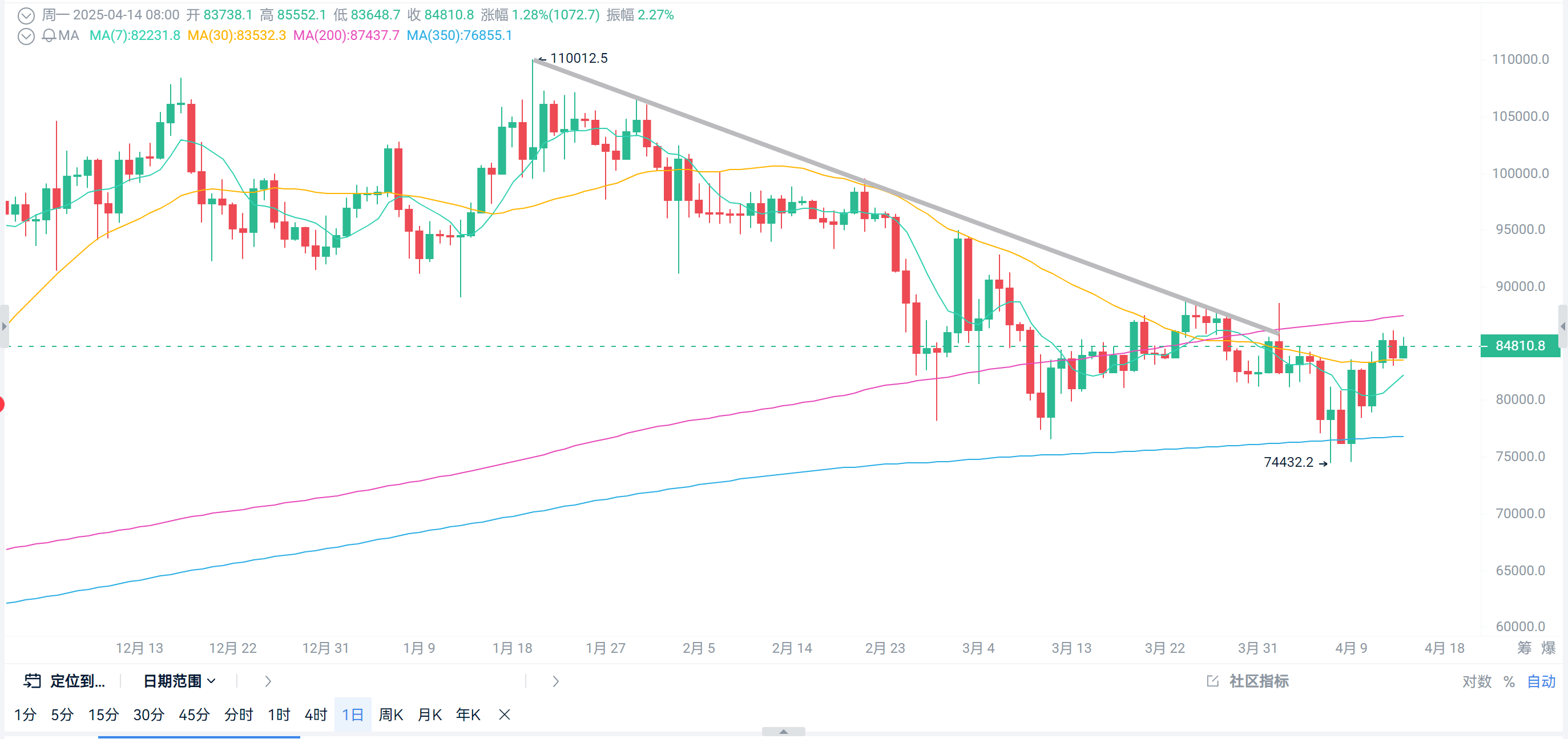 Although the global market was relatively turbulent last week, BTC's performance, in terms of results, also rose by ten thousand points. A rough estimate shows that last week it captured more than half of the range's amplitude, and I believe most friends are quite satisfied with this result. This Wednesday, March retail sales data will be released, expected to grow by 1.4% month-on-month, far exceeding February's 0.2%. The market will closely observe whether American consumers changed their spending behavior before and after Trump's tariff measures, especially among the middle and low-income groups, regarding their consumption elasticity in the face of high inflation and uncertainty. If this data does not meet expectations, it may further confirm that the internal demand of the American economy is starting to weaken, thus intensifying concerns about stagflation, ultimately affecting the Federal Reserve's strategy. Additionally, Powell will speak at 1 AM this Thursday, which will likely lead to further market fluctuations. Looking back at BTC's recent price trend, the daily downward trend seems to have changed, which is the first since January's new high. At the beginning of this month, there was a brief breakthrough, but it ultimately did not effectively break the downward trend line. After BTC breaks the downward trend line, combined with the weekend's impact, there are currently signs of some consolidation. Before reclaiming the 200-day moving average, BTC may continue to oscillate and consolidate. The short-term and long-term moving averages have maintained a certain range, and the global M2 money supply also indicates that BTC will have a relatively positive trend in the coming months. Moreover, the continued weakness of the dollar is very favorable for risk assets.