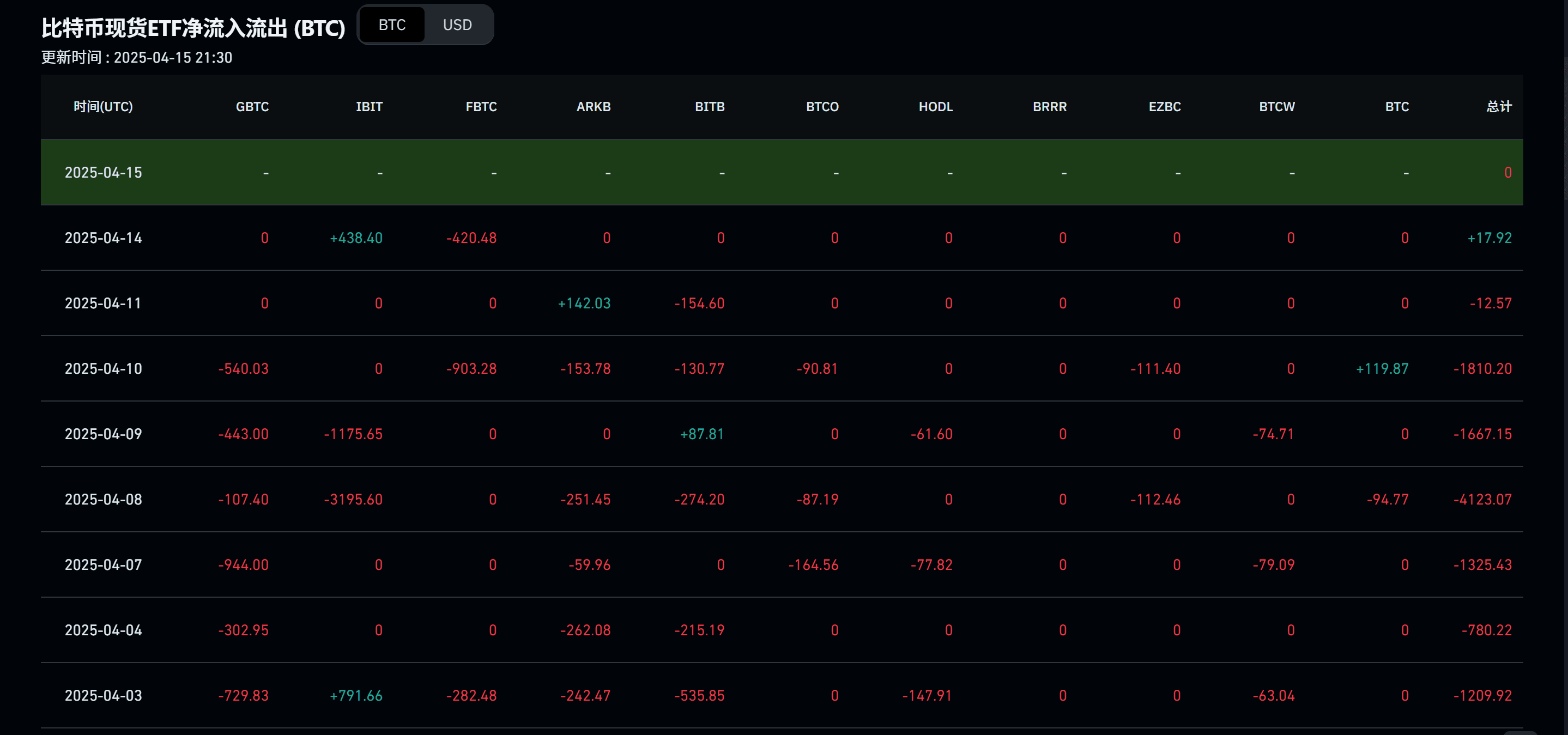 The recent performance of the BTC spot ETF has indeed been unsatisfactory. Over the past eight trading days counting back from the 14th, there has been a net outflow of funds totaling $1.2 billion, with the main withdrawal forces being IBIT, FBTC, and GBTC. On April 8, IBIT alone withdrew $253 million. Although BTC prices have seen a slight rebound recently, major institutions have not taken aggressive positions, and traditional funds remain in a wait-and-see posture. Therefore, the future direction of the Federal Reserve's interest rates is still not very clear, and regulators have not made it clear who wants to take on the role of the buyer at this time. Bottom-fishing seems to still be suppressed by observation. Overall, however, we are very close to the bottom of the market now. Taking a small portion of positions to attack is not a big problem. To put it simply, the ETF is a funding channel between traditional finance and the crypto world, but currently, this channel is not very smooth. Firstly, there are no new strategies, and the market lacks new breakout points. According to Wall Street institutions, this wave of decline may continue to probe lower, but Lao Yi still firmly believes that BTC's rebound is just a matter of time.