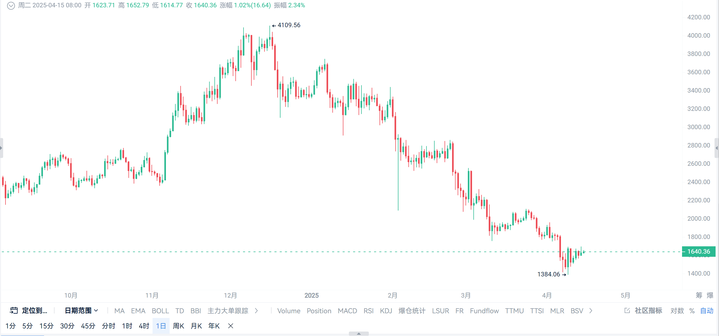 On the other hand, let's take a look at ETH, which everyone is concerned about. From the perspective of value investors, it can be affirmed that it is distinct from other altcoins. Even though its recent performance has not been satisfactory, it is still the leader among altcoins, and in Lao Yi's definition, ETH has never been categorized as an altcoin. First, from the perspective of chips, some negative news can be seen. The OG who participated in the 2015 ICO with 100,000 ETH has now entered a regular selling phase, selling about $1 million (630 ETH) every two days. At this pace, it will be sold out in the next three months. This continuous selling pressure from the chip and sentiment perspective has put consistent downward pressure on ETH. However, at the same time, some new whales and addresses have been buying ETH, so in Lao Yi's view, this whale's selling can be completely offset, and there is no need to worry too much about it. However, from an overall pattern perspective, ETH is still in a downward trend and is certainly weaker compared to BTC. In the short term, there are no significant news developments yet, and like BTC, it still needs to continuously monitor macro-level developments.