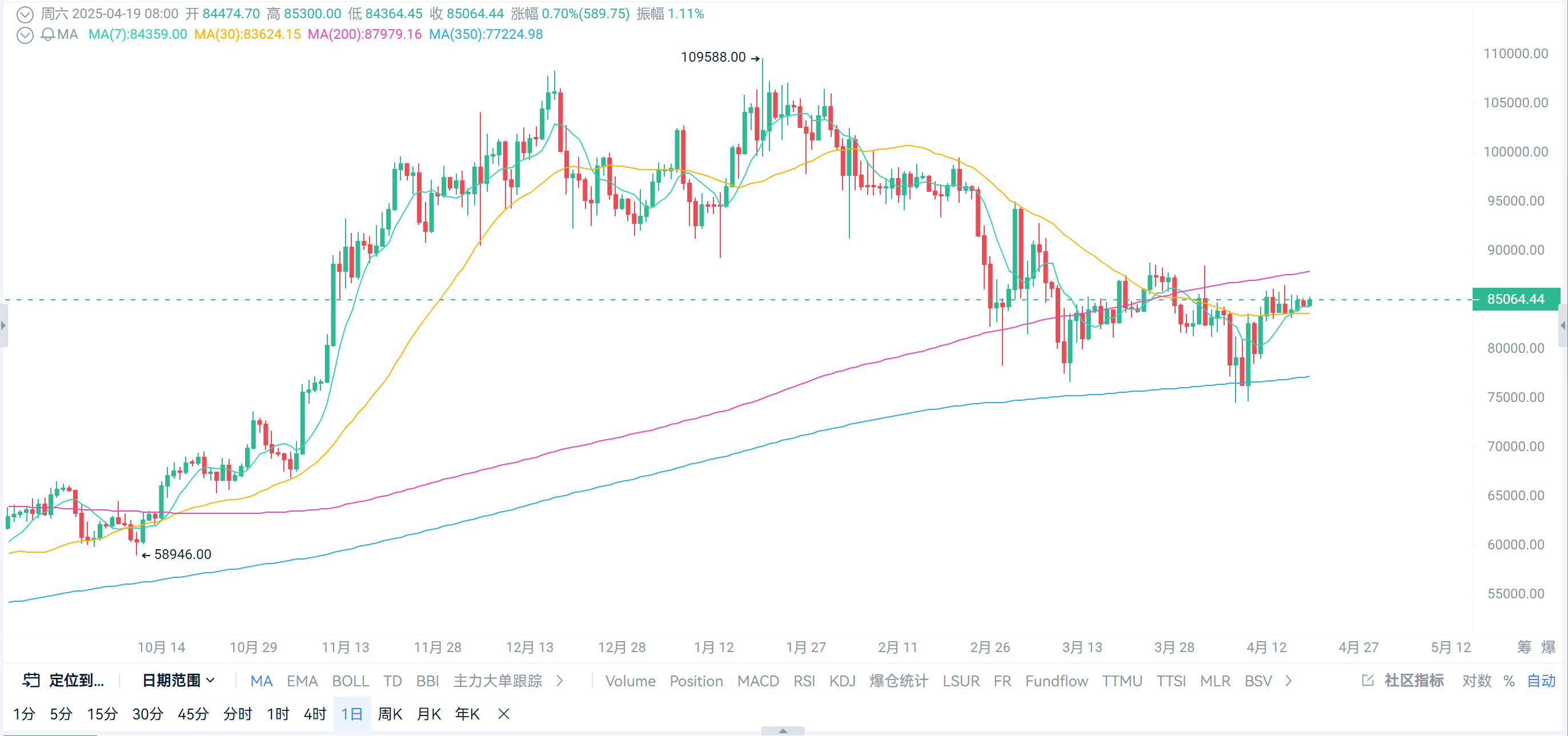 With the fluctuations in the US Treasury market, Trump has suspended tariffs for 90 days, while our trade war with the US continues to escalate. However, yesterday Trump stated that he is in dialogue with us, hinting that a certain agreement might be reached regarding the tariff war. But we all know Trump could reverse his statements at any time. Regardless of the favorable or unfavorable developments, BTC has stabilized at $76,000, and the 365-day moving average has not yet completely broken down. The short and long-term technical moving averages have begun to intersect or overlap, similar to the consolidation from August to October last year. However, the market will eventually provide a clear direction, and during this time everyone needs to remain patient. Currently, the proportion of short-term funds is rapidly declining, but long-term holders are still accumulating more chips. Old Yi is looking forward to the third wave of chip distribution, which also means BTC will break new highs. As for the altcoins that everyone is concerned about, Old Yi still holds the same view: focus on value investment; the rest you already have a clear answer in your heart! Looking at it this way, BTC doesn’t seem so complicated. As long as the global money supply continues to expand, BTC will keep rising.