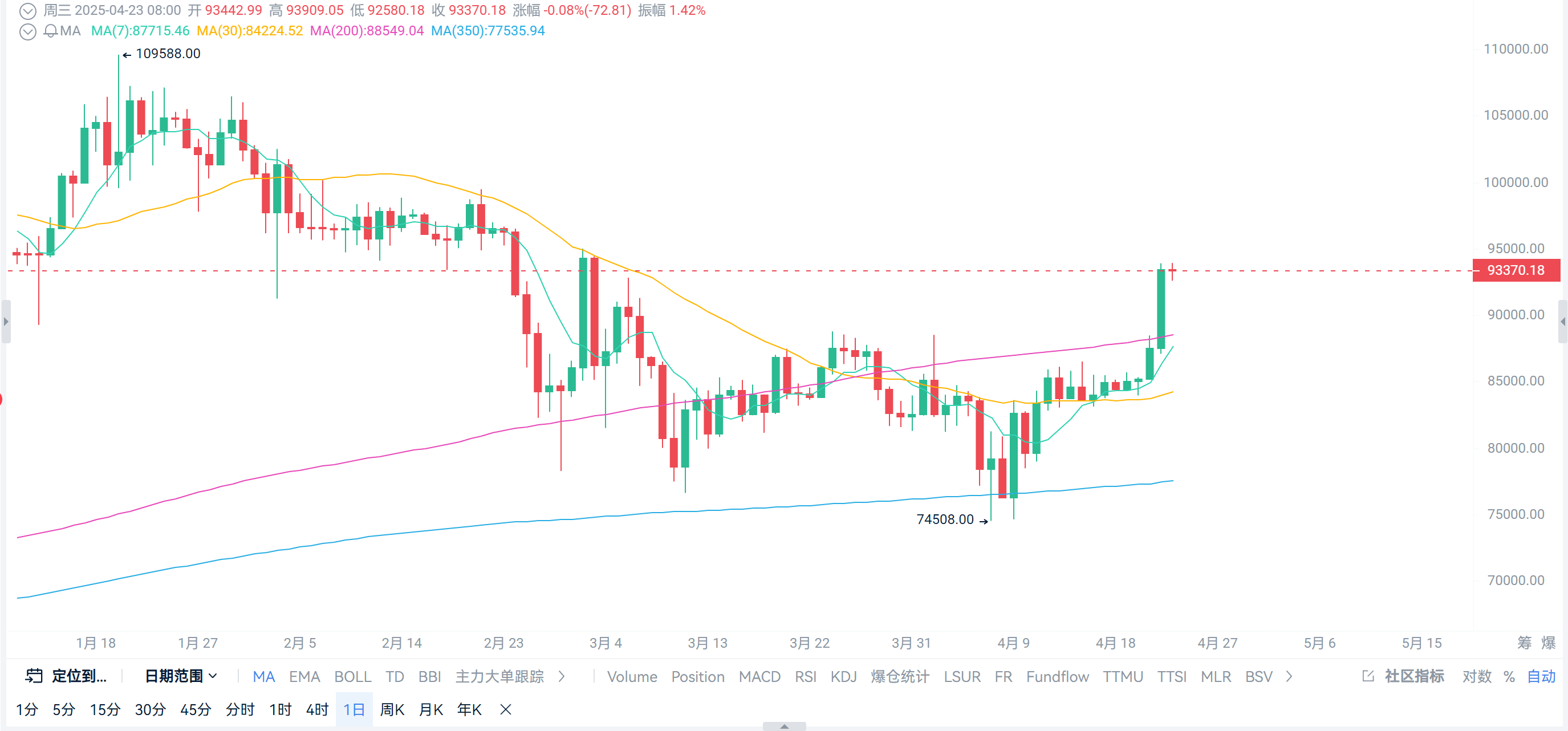 The market is in a festive mood again. BTC's price trend this week has shown a significant contrast with the US stock market. While the US stock market continues to decline due to tariff issues, BTC's price has risen against the trend during this period, reaching a short-term high of $93,888. The global M2 money supply expansion is gradually reflecting in BTC's price. Currently, it seems that BTC reaching a new high is not a difficult task, but this process will not be a straight upward trend, and everyone still needs to be alert to risks. Due to large price fluctuations, a new CME gap has formed again, starting at around $91,700. BTC has a demand to fill this gap downwards; short-term fluctuations are the norm in the market, and the US stock market also saw some gains yesterday. The previous decline in the US stock market mainly stemmed from the negative economic effects brought about by the continued fermentation of tariff issues, and the risk of an economic recession in the US continues to rise, with related negative news frequently appearing. Market concerns about the US economy are not only due to the risk of negative GDP growth but also focus on the yield of 10-year US Treasuries, which has been maintained at a high level recently, reaching close to the sensitive warning line of 4.5% set by Trump. This indicates that the attractiveness of US Treasuries is decreasing, and investor purchasing willingness is weakening, with the US dollar index also continuing to decline, recently hitting a new three-year low.