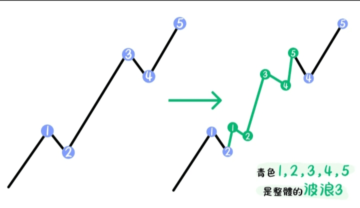 In wave theory, Wave 3 is typically the strongest segment of the impulsive wave, and it may consist of smaller waves, namely the sub-wave structure of Waves 1 to 5.