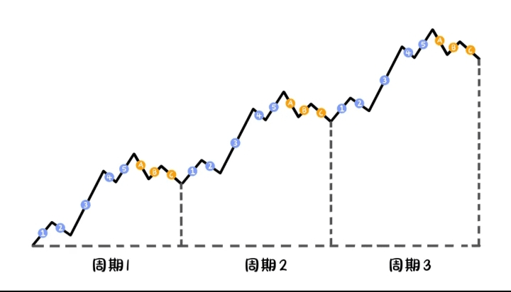 A complete wave cycle consists of five main upward waves (1-2-3-4-5) and three corrective waves (ABC), forming a total of a '5-3 wave structure'.