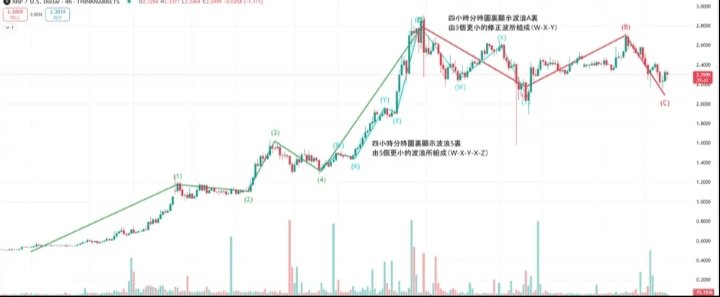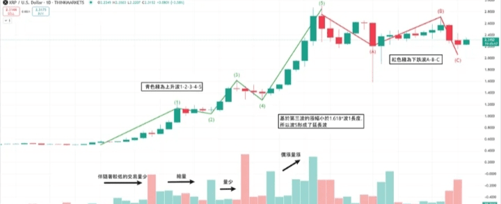 From the XRP daily chart, we can see that the market trend follows the typical structure of Elliott Wave Theory, showing a complete five-wave impulsive wave (green segments indicate 1-2-3-4-5) and the subsequent three-wave corrective wave (red segments indicate ABC).