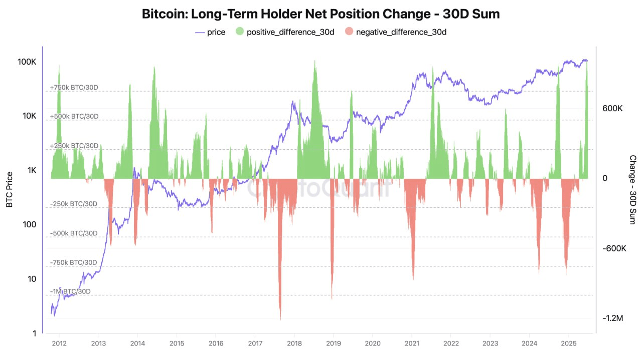 Long-term holders have increased their holdings by 800,000 BTC in a single month, setting a new historical high.