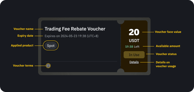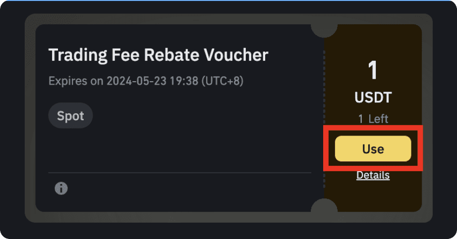 Click the [i] button on the voucher to view more details, including its nominal value, expiration date, eligibility, and the amount of trading fee discount reward.
