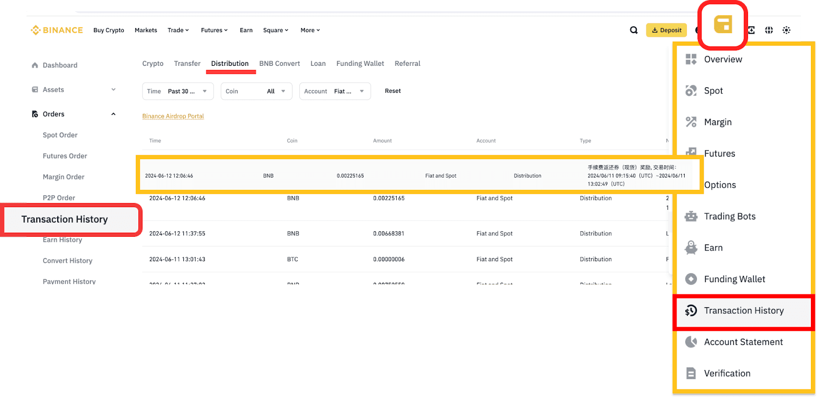 You can view the redemption history by going to the "Wallet" icon, then [Transaction History] and selecting the [Distribution] tab.