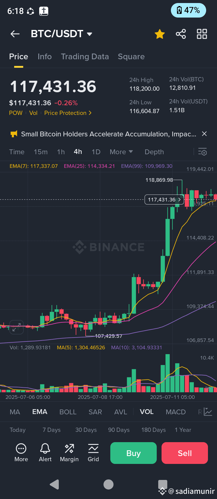 Bitcoin continues to hold strong above the $117K level, with recent price action showing a healthy uptrend. After a solid breakout from the $107K–$109K range, BTC surged past multiple resistance levels and is now consolidating just below its local high of $118,869.98.