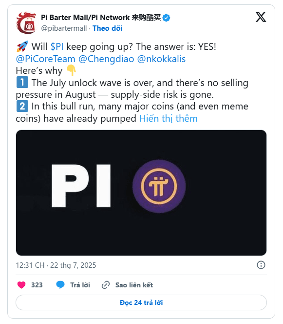Currently, Pi Coin is trading at $0.4789, up 5.6% in the past 24 hours, with a trading volume of over $246 million. Analysts note that with fewer newly unlocked coins and stable trading volume, this is an ideal condition for Pi Coin to increase in price. Dr. Altcoin predicts that the price of Pi may begin to rise naturally by the end of August.