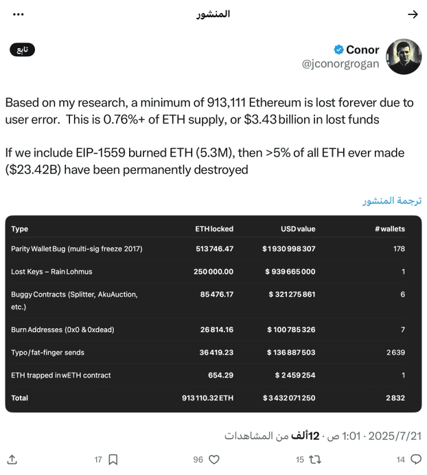 A recent post on GitHub documented that Conor Grogan -head of investment products at Coinbase- reported the permanent loss of more than 912,000 Ethereum (Ethereum) coins due to user errors or protocol failures, representing over 0.76% of the circulating supply of ETH. Grogan collected wallet addresses from public records and smart contract audits, along with community-provided data, excluding incidents involving uncertain loss of private keys, with the analysis including only coins that have been definitively proven to be inaccessible.