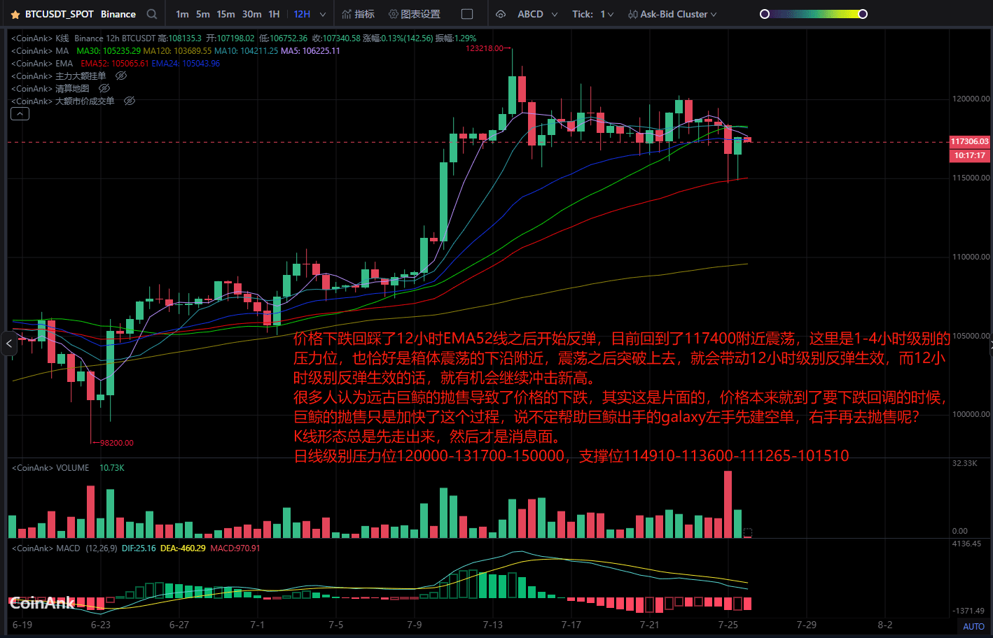 After the price dropped and retraced to the 12-hour EMA52 line, it started to rebound. It is currently fluctuating around 117400, which is a resistance level on the 1-4 hour chart, and it happens to be near the lower edge of the range. If it breaks upward after this fluctuation, it will initiate a rebound on the 12-hour level. If the 12-hour rebound is effective, there will be a chance to continue to challenge new highs.