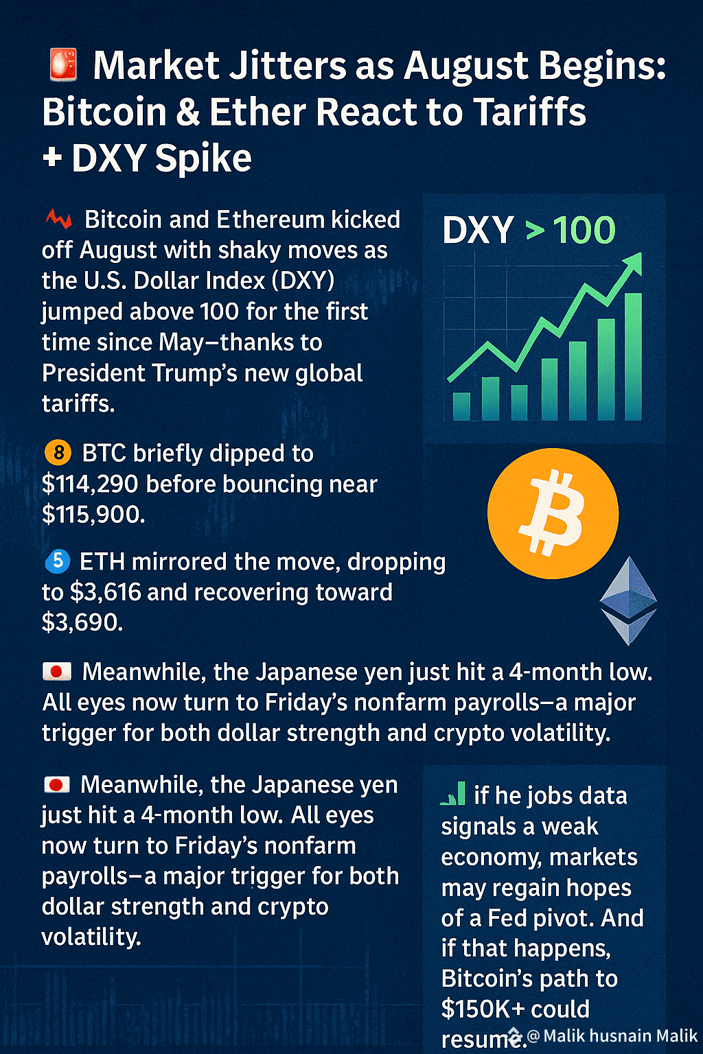 📉 Bitcoin and Ethereum kicked off August with shaky moves as the U.S. Dollar Index (DXY) jumped above 100 for the first time since May—thanks to President Trump’s new global tariffs.