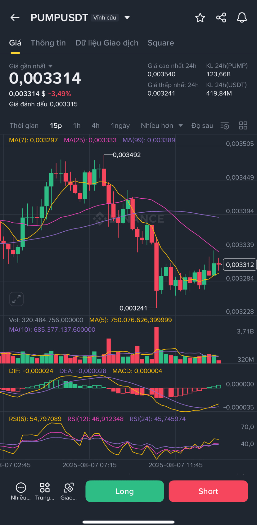 The 1h frame shows that PUMP is trying to bounce back after hitting the bottom at 0.003241. The most recent candle has narrowed the decline, RSI(6) is at 41 – indicating that selling momentum is weakening, allowing room for recovery.
