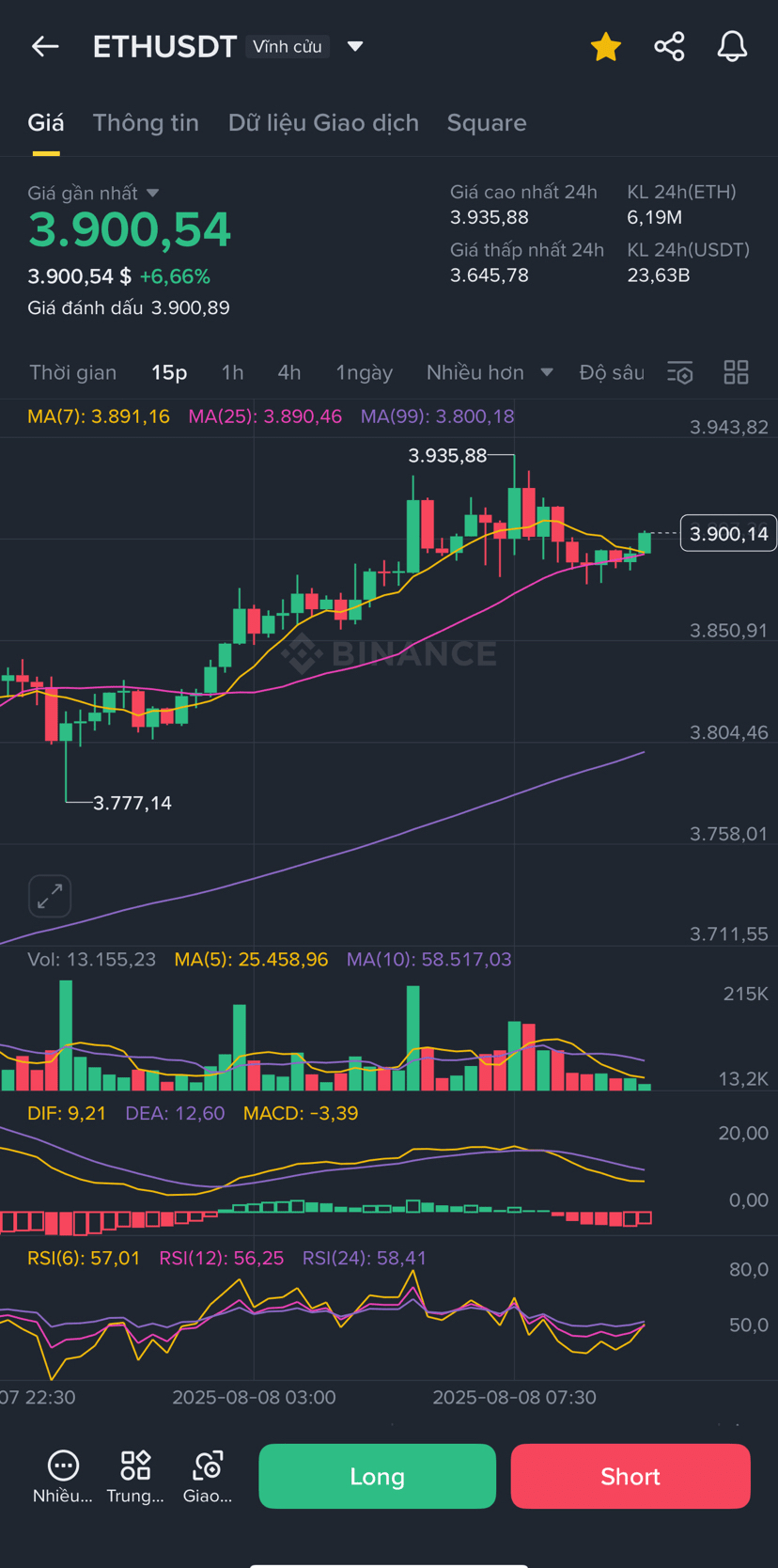 The 15-minute chart shows ETH bouncing strongly multiple times when touching 3,800, indicating a solid support area. The price is currently slightly above MA25 (3,890) and RSI(6) is at 57 – still room for upward movement. MACD has narrowed the negative area, gradually moving towards zero → buying force is returning.
