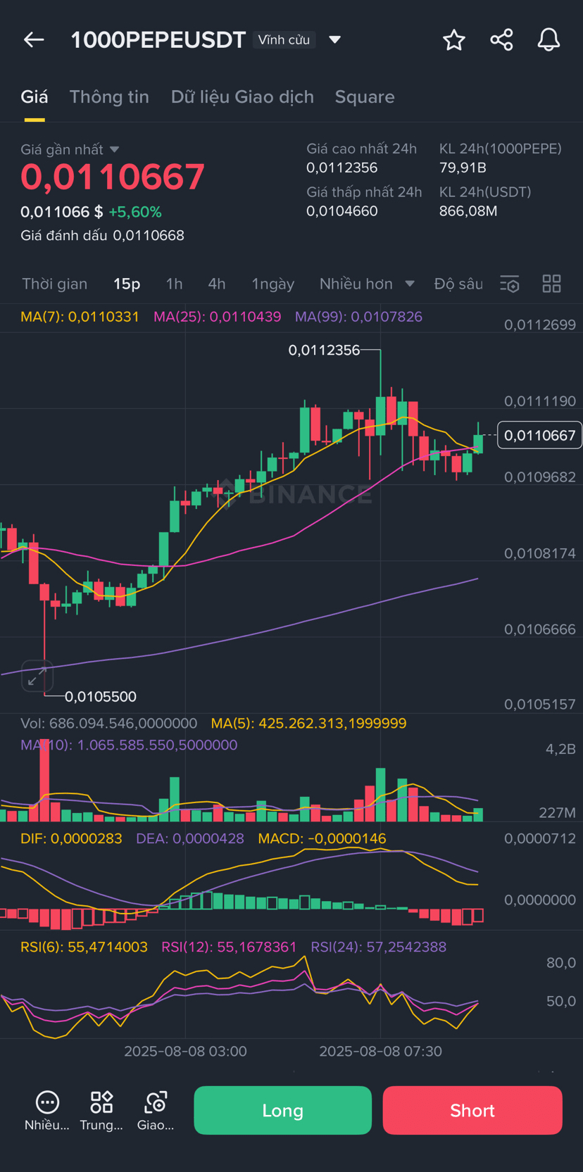 On the 4h timeframe, PEPE has clearly broken out from the bottom of 0.00986, surpassing MA7 and MA25, creating a new peak at 0.0112356. Currently, the price is holding above MA7 (0.01083) and MA25 (0.01052) → the uptrend structure remains intact.