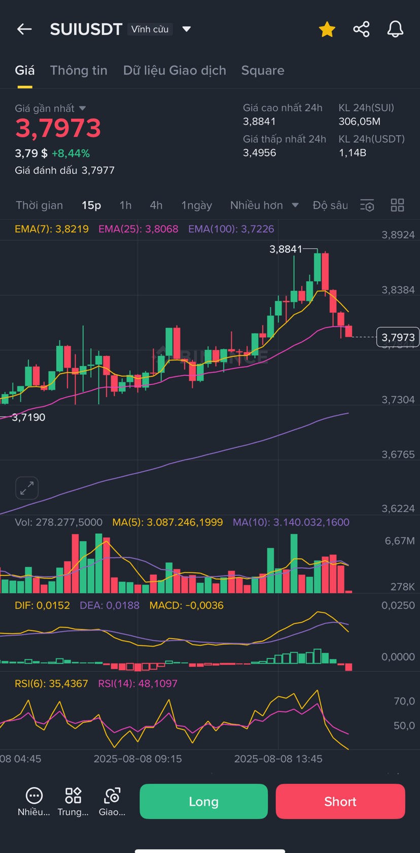 The 15-minute timeframe shows clear selling pressure from the area of 3.88, with the price quickly dropping to 3.79. EMA7 is cutting down through EMA25, RSI(6) is at 35 → slightly oversold state, a technical rebound may appear.