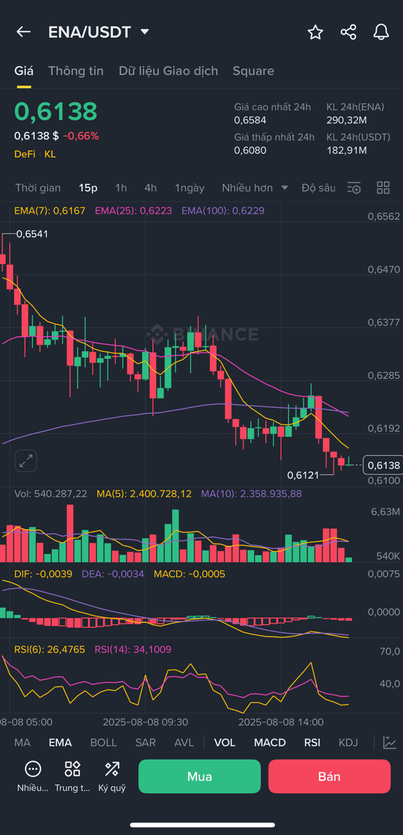 On the 15-minute frame, ENA has touched the bottom of 0.6121 and bounced slightly; however, it is still blocked by EMA25 above. RSI(6) is at 26.47 → in the oversold zone, a slight recovery may occur.