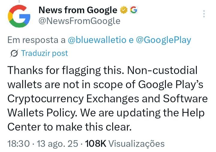 Above, the forecast about the updated context was mentioned: After the backlash, Google clarified that non-custodial wallets (self-custody) do not require licenses on the Play Store, updating the Help Center.