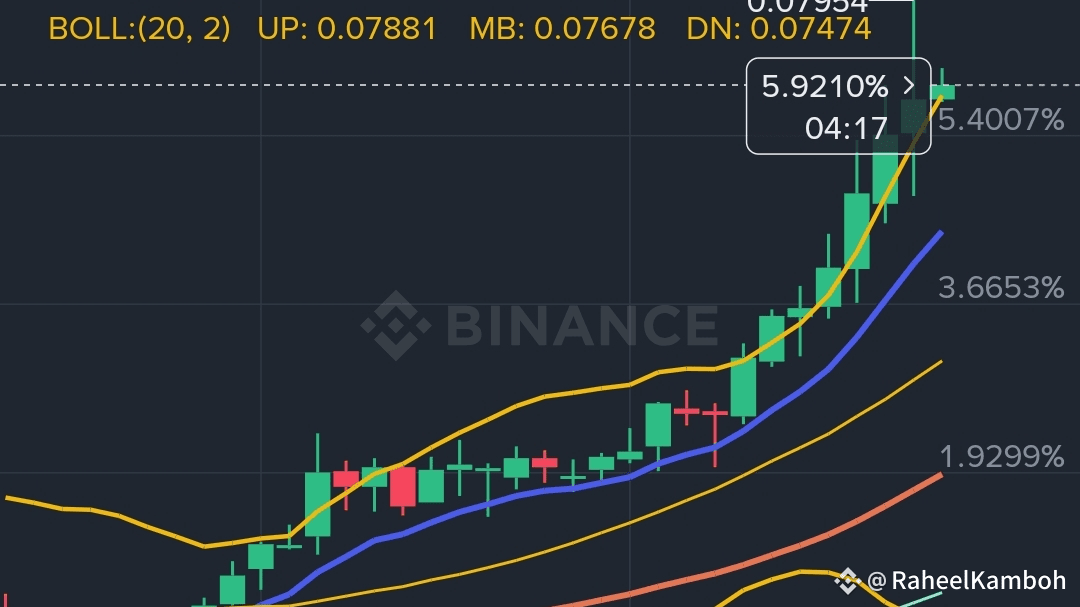 - **0.07878** (+9.58%), **BREACHING UPPER BOLLINGER BAND** (0.07823) → **MAX STRETCH!**