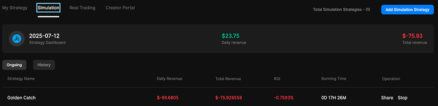 In AIW3, users can first run strategies with simulated funds in a real market environment to verify their stability under different market conditions. The simulation platform will provide daily revenue, total revenue, return on investment (ROI), runtime data, etc., helping users assess whether the strategy is worth live investment.