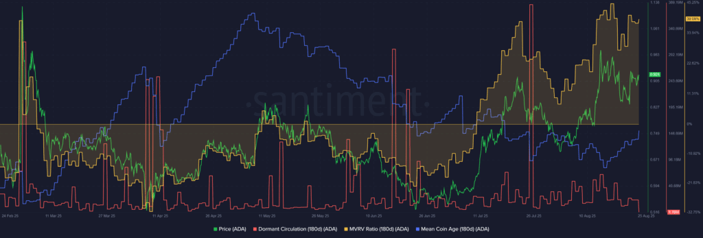 The bullish structure of Cardano and the challenge of the $1 resistance level suggest that many holders may take profits 💰. The 180-day MVRV indicator shows that holders do have a profit-taking pressure, but so far, this threat has not materialized.