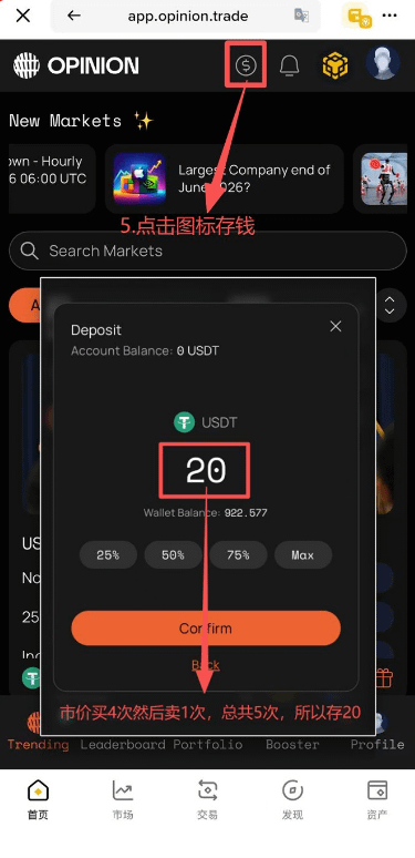 Click on the 'Portfolio' page below, then click the 'Deposit' button to recharge funds to the wallet address generated on the Opinion platform. Then click here
