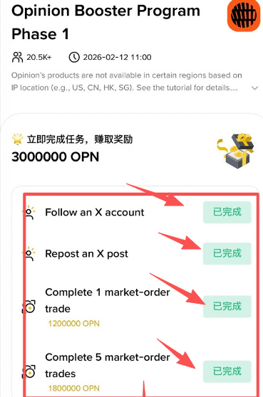 Then complete these tasks to follow the project party X account, retweet the specified tweet, complete 1 market price prediction event transaction (1.2 million $OPN reward), complete 5 market price prediction event transactions (1.8 million $OPN reward)