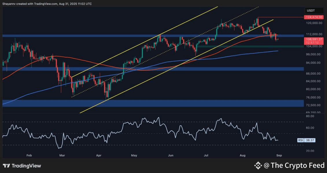 The 4-hour chart shows a clear bearish trend, with the price consistently forming lower peaks and troughs within a narrow descending channel. The support levels at $117,000 and $110,000 have been definitively breached and subsequently retested, making the $104,000 fair value gap the next logical target. The RSI, sitting below 50, confirms the bearish momentum. The price is also nearing the Fibonacci golden zone, with the 78.6% retracement level aligning with the $104,000 fair value gap. This area is a key target and could be a point of potential recovery, and how the market responds to this level will be a significant factor in determining the future direction over the coming weeks.