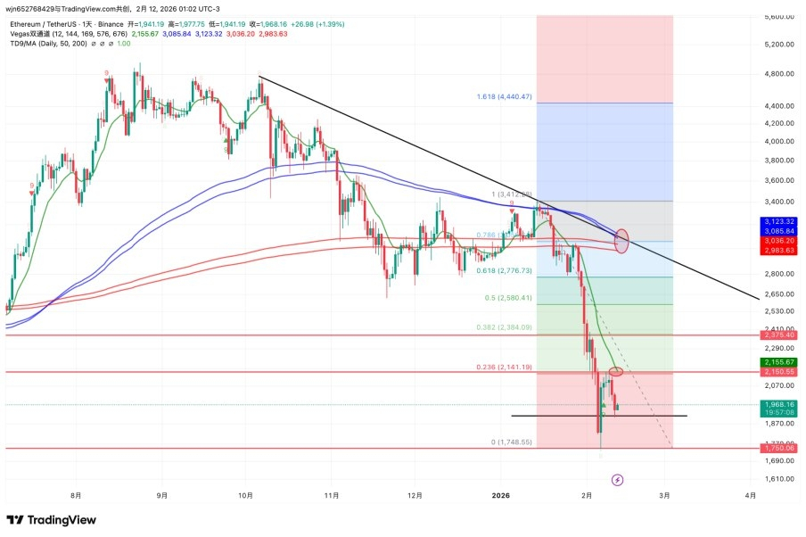 (2) Last week's weekly chart showed a bullish Pinbar. What is a bullish Pinbar: First, the lower shadow is 2 times or more the body; secondly, it must be at a key support level, and it must have high volume. All of the above must be satisfied. If currently going long is solely based on the bullish Pinbar entry logic, one can enter at half the position of the lower shadow of the Pinbar, placing a stop loss at the bottom of the lower shadow. Yesterday's pullback low was around 1900, which is the 50% entry point of the Pinbar's lower shadow, so yesterday's first take profit point for ETH short position in the member area was around 1900.