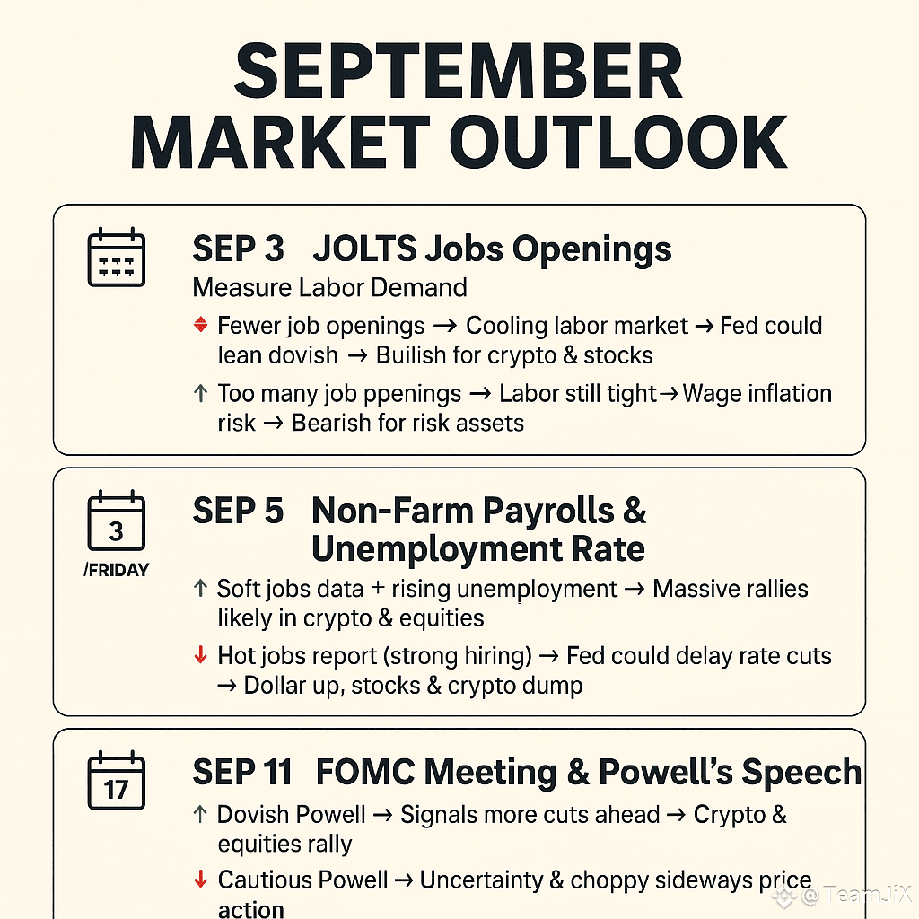 September is shaping up to be one of the most critical months for the markets. A series of major macroeconomic events are lined up, and each one can trigger huge moves in equities, crypto, and the dollar. Mark these dates and plan your trades accordingly: