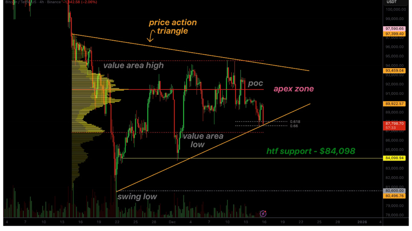 A confirmed break and close outside the compression range with expanding volume defines direction. Until then, the market is coiling.