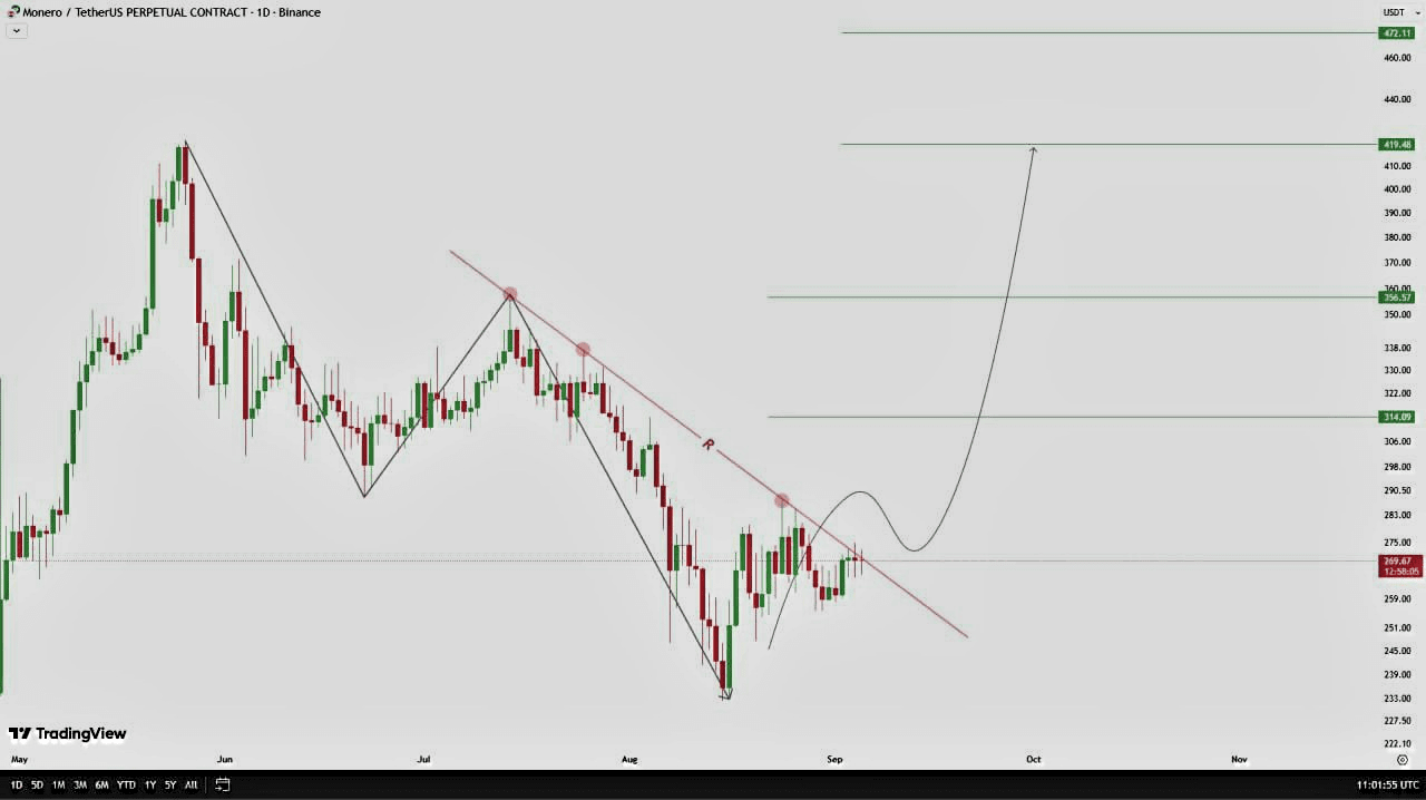 $XMR The price formed a pattern, and if the downward trend line is broken, it can be considered an upward movement. We have also identified the targets we expect to reach on the chart. The analysis is correct if the price manages to break the trend line with a strong candle, and we can prepare to enter it.#XMR