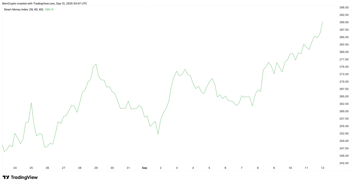 Alongside the whales, the smart money index, which tracks activity from high-conviction addresses, rose from 261.62 on September 7 to 290.14 today. These wallets often buy on strength and sell quickly at highs. Their increased activity suggests bets on continued price increases.