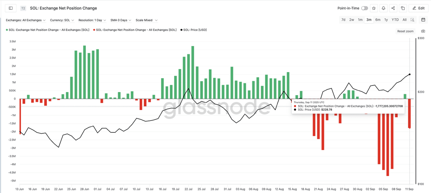 This activity is also reflected in the net position change metric on exchanges. On September 10, while Solana was rising, around 291,000 SOL flowed into exchanges. Typically, these inflows indicate profit-taking. However, just one day later, when Solana surpassed $227 (a key level on the price chart later), the balance sharply turned negative, indicating external outflows of 1.77 million SOL.