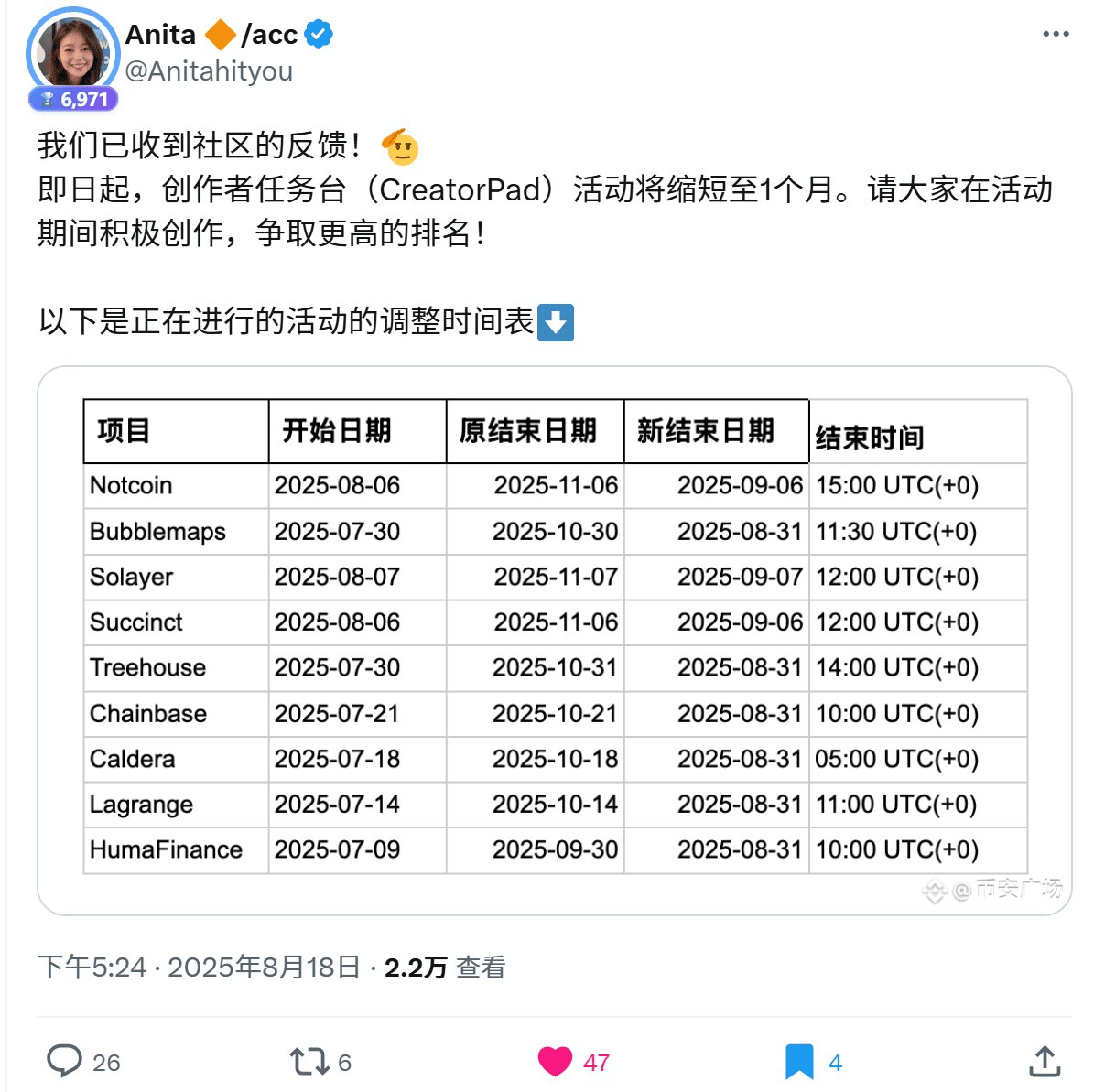 Due to community feedback, square massage therapist @Anitahityou posted on 8.18 to explain that the CreatPad activity has been shortened to 1 month, but the reward amount remains unchanged.