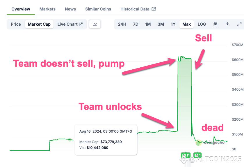 – Price stays flat, but market cap quietly 2x or 3x from unlock dilution