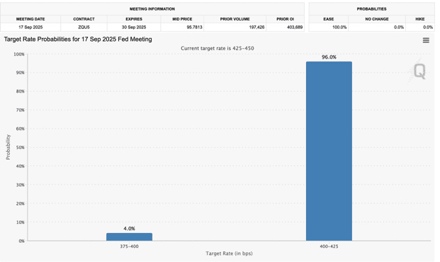 The CME Group's FedWatch tool shows that market participants support a 96% probability of the Fed lowering interest rates to a range of 4.00% to 4.25%. The remainder of the market participants are looking for a 50 basis point cut.