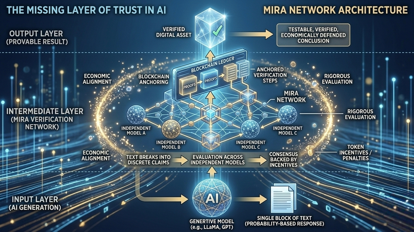 Mira introduces a verification layer that treats every AI output as something that must earn its credibility. Instead of accepting a model’s response as a single block of text, the system breaks it into discrete claims. Those claims are then evaluated across a distributed network of independent models. Validation is not based on trusting one authority. It is based on consensus backed by incentives.