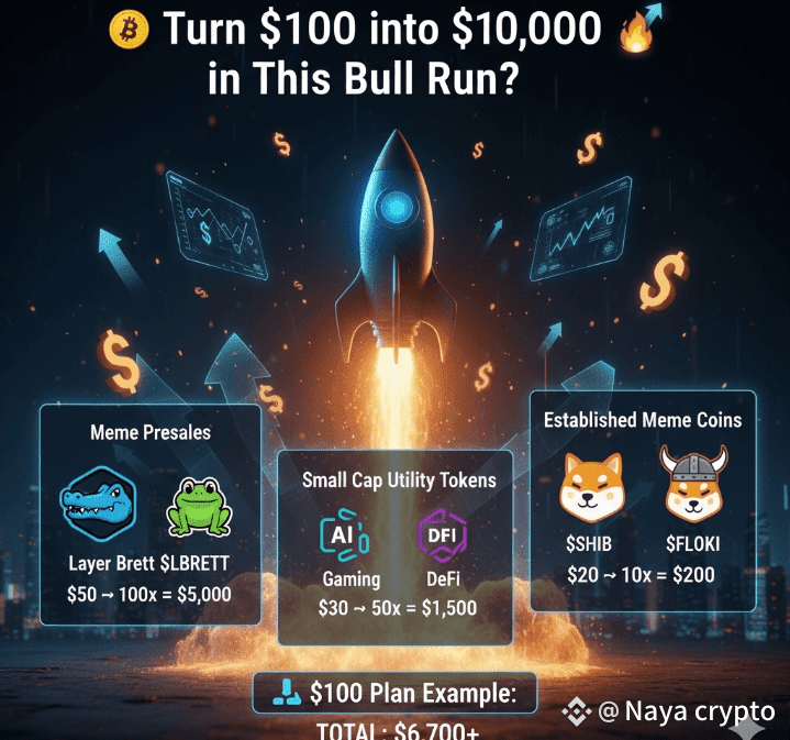 Everyone dreams of 100× gains in a bull run—and yes, it’s possible! But remember, this only works with a high-risk, high-reward strategy. Here’s how I’d split it: