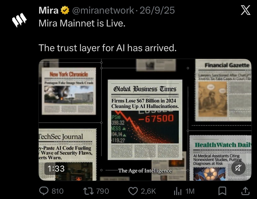 I remember the exact moment the Mira thread dropped. September 26, 2025, 11:14 GMT – @miranetwork posted “Mira Mainnet is Live” with a short video that felt more like a quiet announcement than a hype explosion. No fireworks, no countdown timer, just a clean statement: the trust layer for AI had arrived.