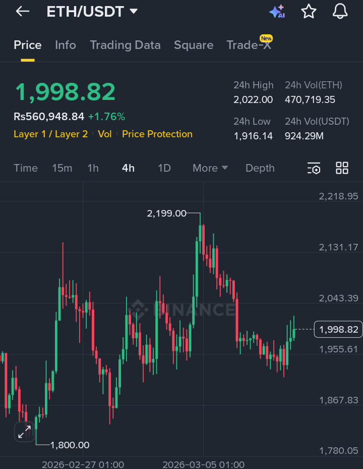 $ETH is currently trading at $1,998.82, showing a +1.76% gain as it battles to reclaim the psychological $2,000 level. The token touched a 24-hour high of $2,022.00 and a low of $1,916.14, with substantial volume of 470,719 ETH and $924.29M USDT confirming active market participation.
